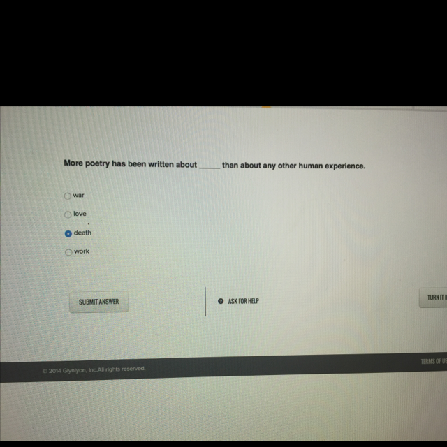 More poetry has been written about ___ than about any other human experience. Is it war ,love,death or work