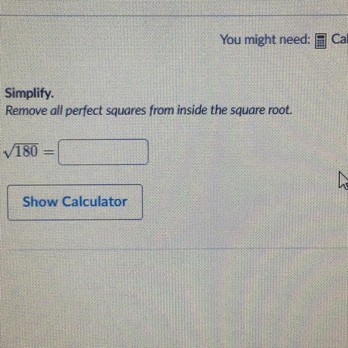 Simplify. Remove all perfect squares from inside the square root. V180=