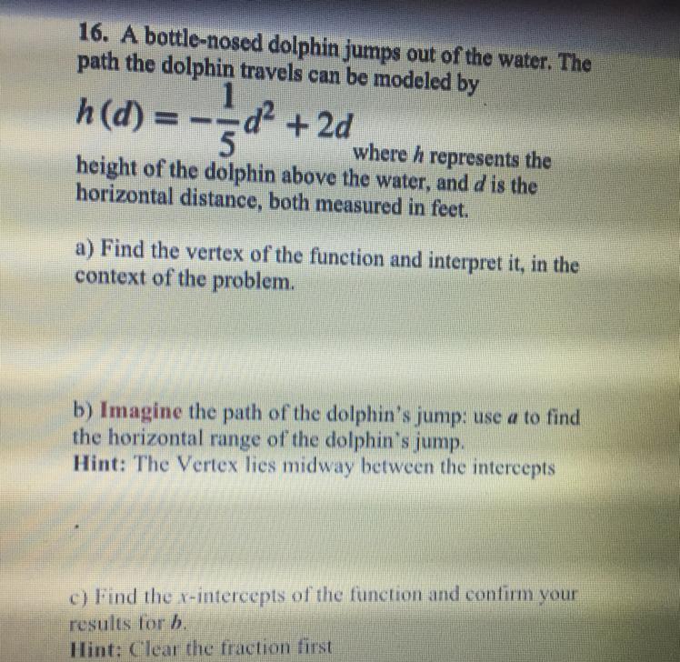 From part A above, we found x = 5 to be the x coordinate of the vertex. Simply double this value to get 10 as the answer. The reason why this works is because x = 0 is the starting x intercept, or the starting point which the dolphin jumps from. Also, its because of the hint given how the vertex is between each x intercept.