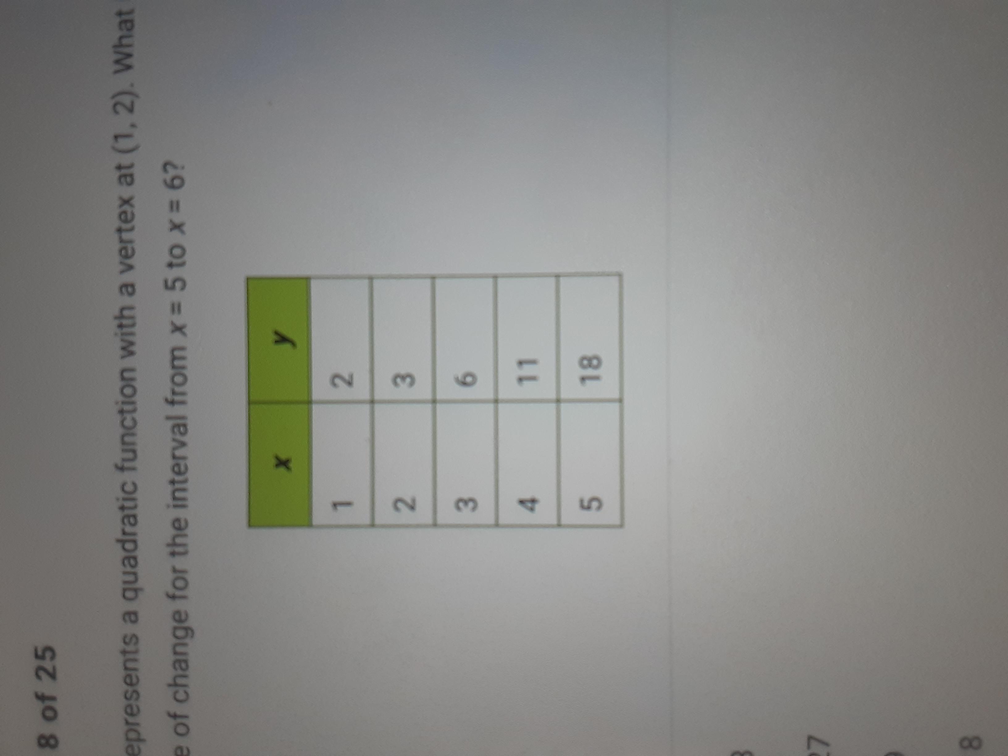 Given that (1, 2) is the vertex of the function represented by the table of values above, the rate of change for the interval from x = 5 to x = 6.