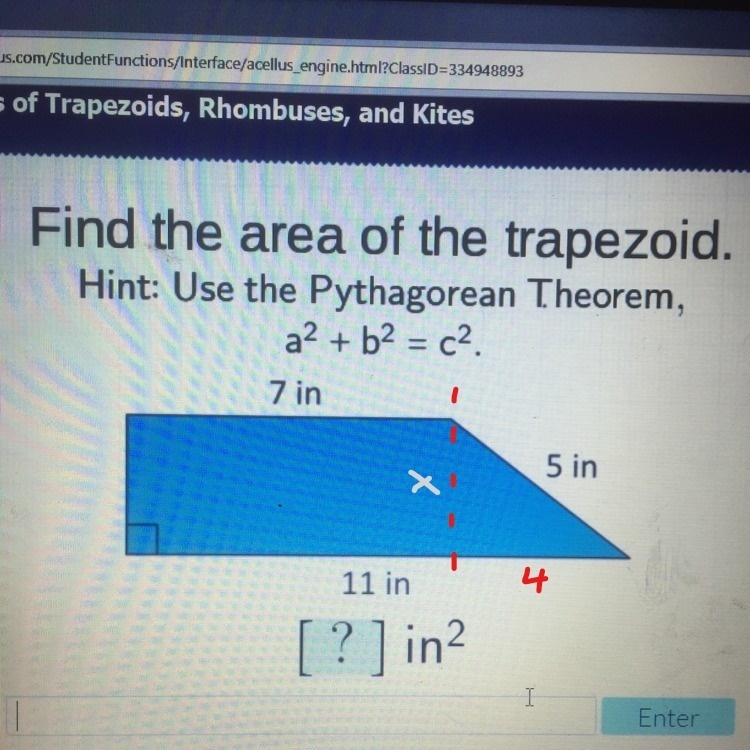 First, split the figure into 2 shapes: a rectangle and a triangle. You know that the bottom length of the triangle is 4, since the length of the complete figure minus the length of the rectangle is the length of the triangle (11 - 7 = 4). Next, as the hint suggests, use the Pythagorean Theorem to solve for the triangle's side on which it splits from the rectangle: