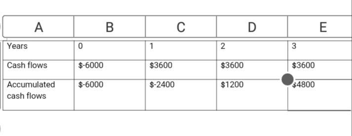 The $3600 cost of the cart would be recouped between the first and second years. Therefore, it would be calculated as 1 year + $2400 / $3600 = 1.67 years