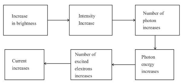On increasing the brightness of light, the intensity increases. With the increase in intensity, the number of incident photon increases. With the increase in number of photon, the photon energy increases. With the increase in energy of photon, number of liberated electrons increases because photon energy is required to excite or liberate the electrons. With the increase in number of liberated electrons, the current increase as current is the rate of flow of electrons with time. Hence, current increases with the increase in brightness of incident light.