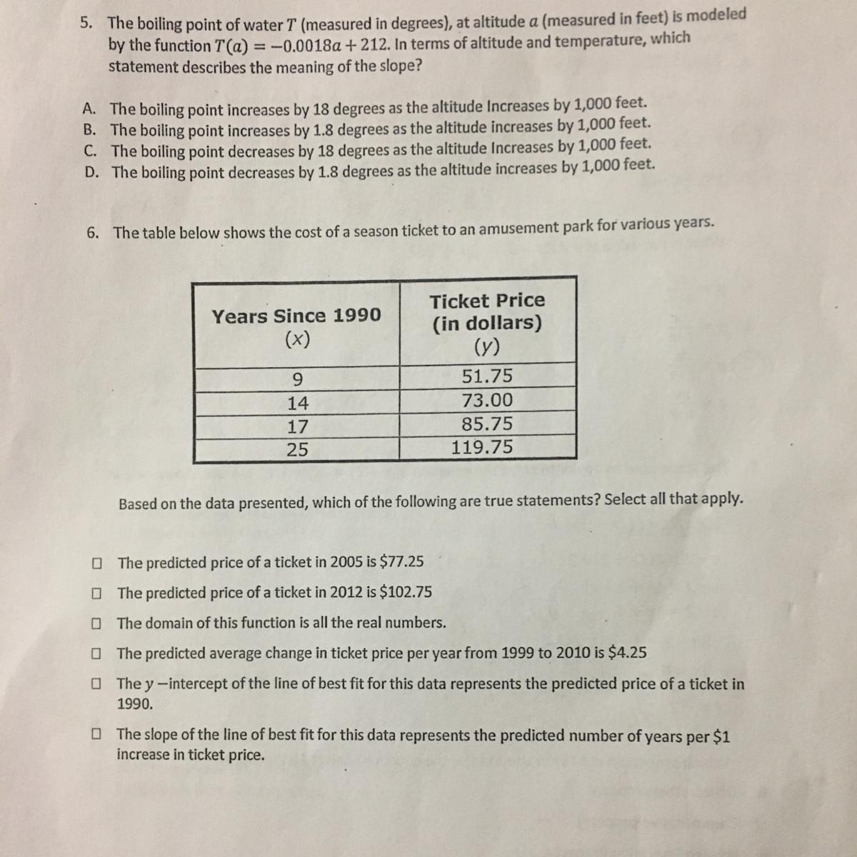 Keywords : function, model, altitude, boiling point, statement, price, tickets, slope, best fit
