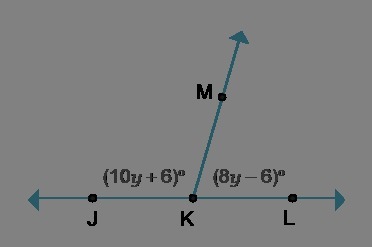<h2>∠MKL = ( 8y - 6 )° = (8 ( 10 ) - 6)° = 74°</h2><h2>∠JKM = ( 10y + 6 )° = (10 ( 10 ) + 6)° = 106°</h2>