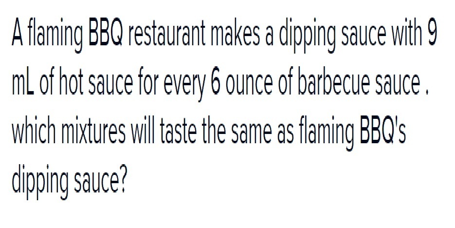 1.5/1-----> for each 1.5 ml hot sauce-------> has 1 ounce of barbecue sauce