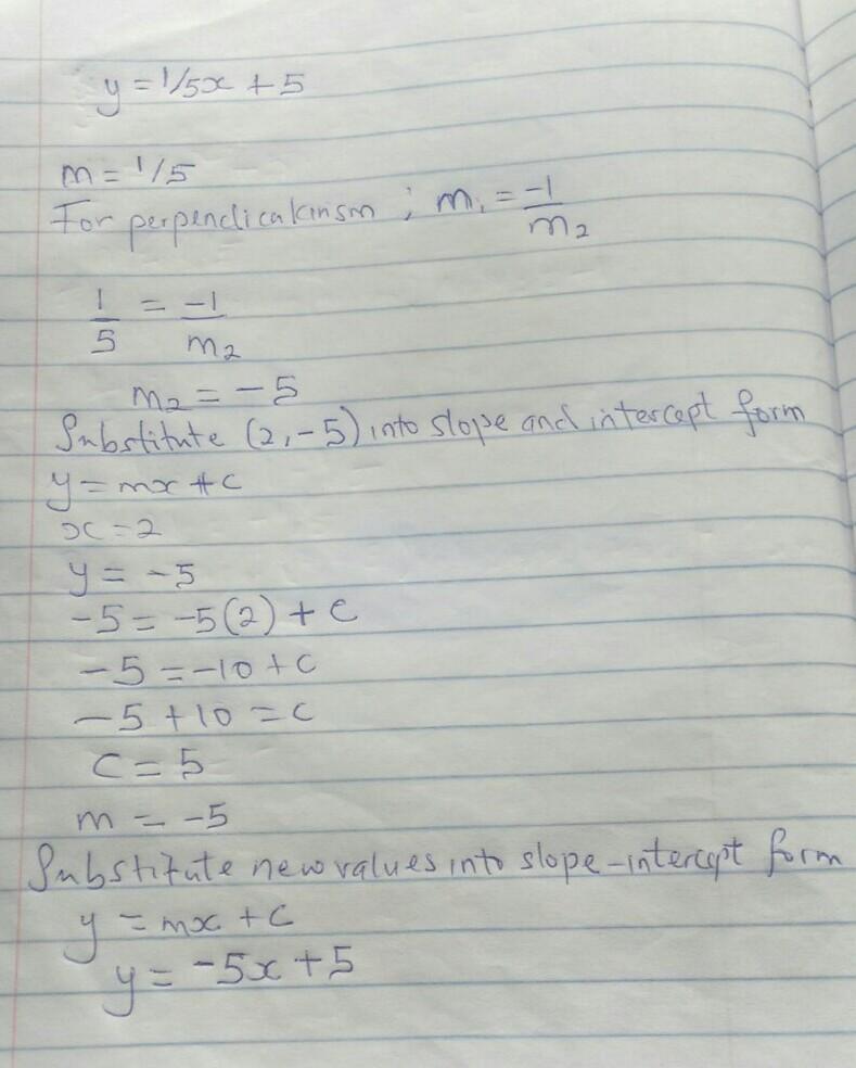So we have y = mx+b update to y = -5x+5 as the perpendicular line.