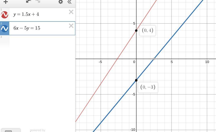The given line has a slope of 1.5 and a y-intercept of 4. We assume that "translated down 7 units" means the y-intercept needs to be -3. "Less steep" will mean the slope is less than 1.5. We can make the slope be 1.2, so it will be less steep.