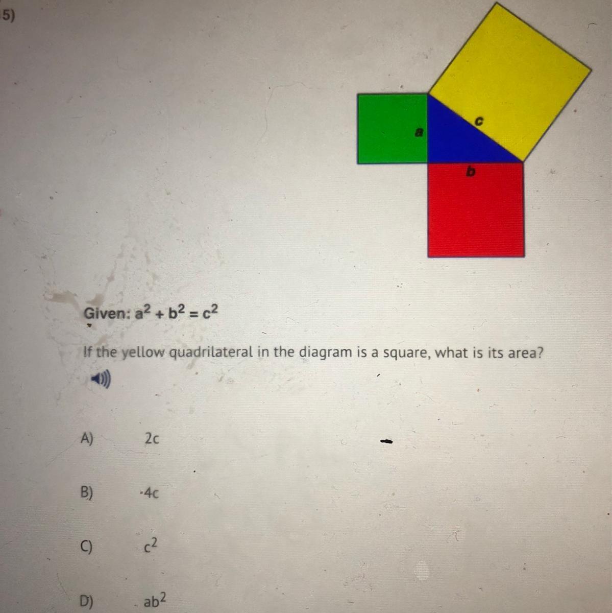 The answer is c^2 because the area of a square is side•side so if one side is c it must be c•c which is c^2