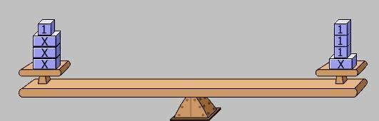 Now, to balance the scale, let us subtract one block x from the left side and subtract three numbered blocks from the right side.