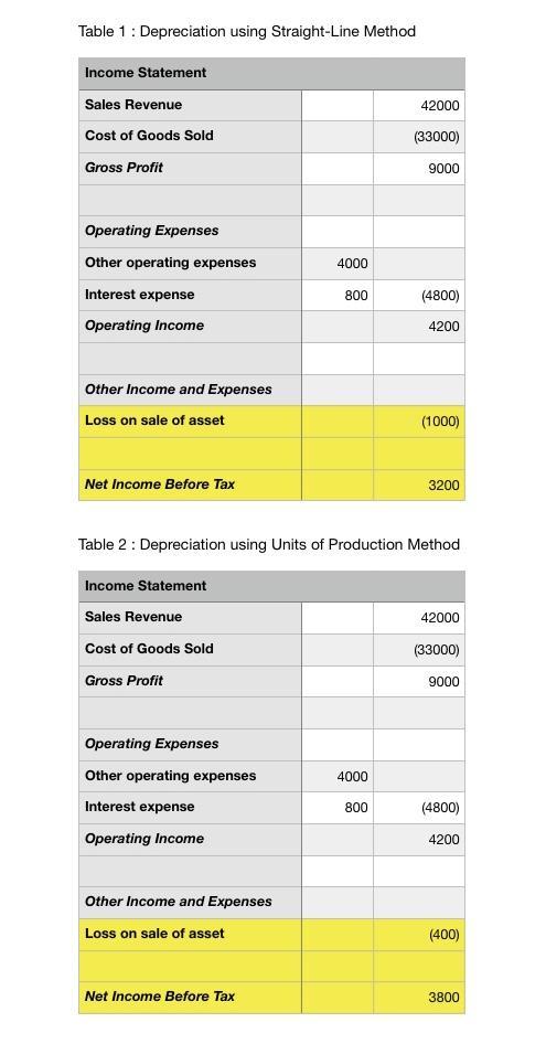 Income statement with gain/loss on sale of asset using straight line depreciation, units of production method and reducing balance method has been provided in attached tables 1, 2 and 3 respectively.
