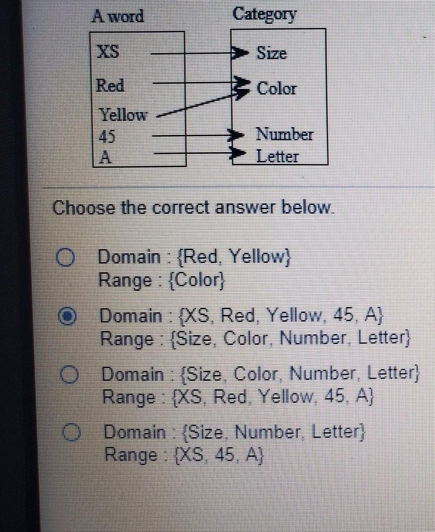The domain of the function shown in the mapping above are all variables that fall under "A word", while the range consists of all variables under "category".
