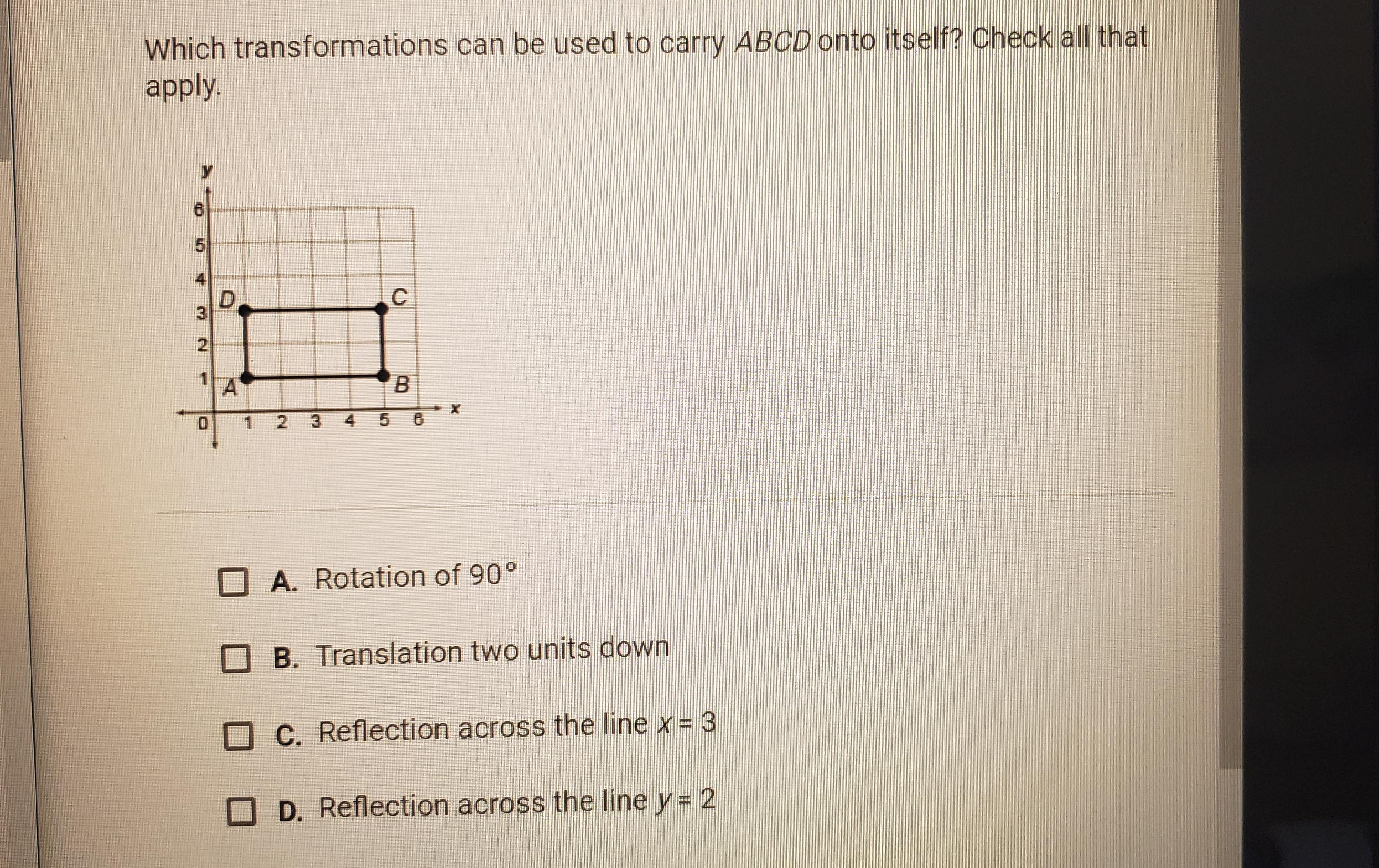 Reflecting ABCD across the line x=3, will carry it onto itself because x=3 is a line of symmetry of ABCD