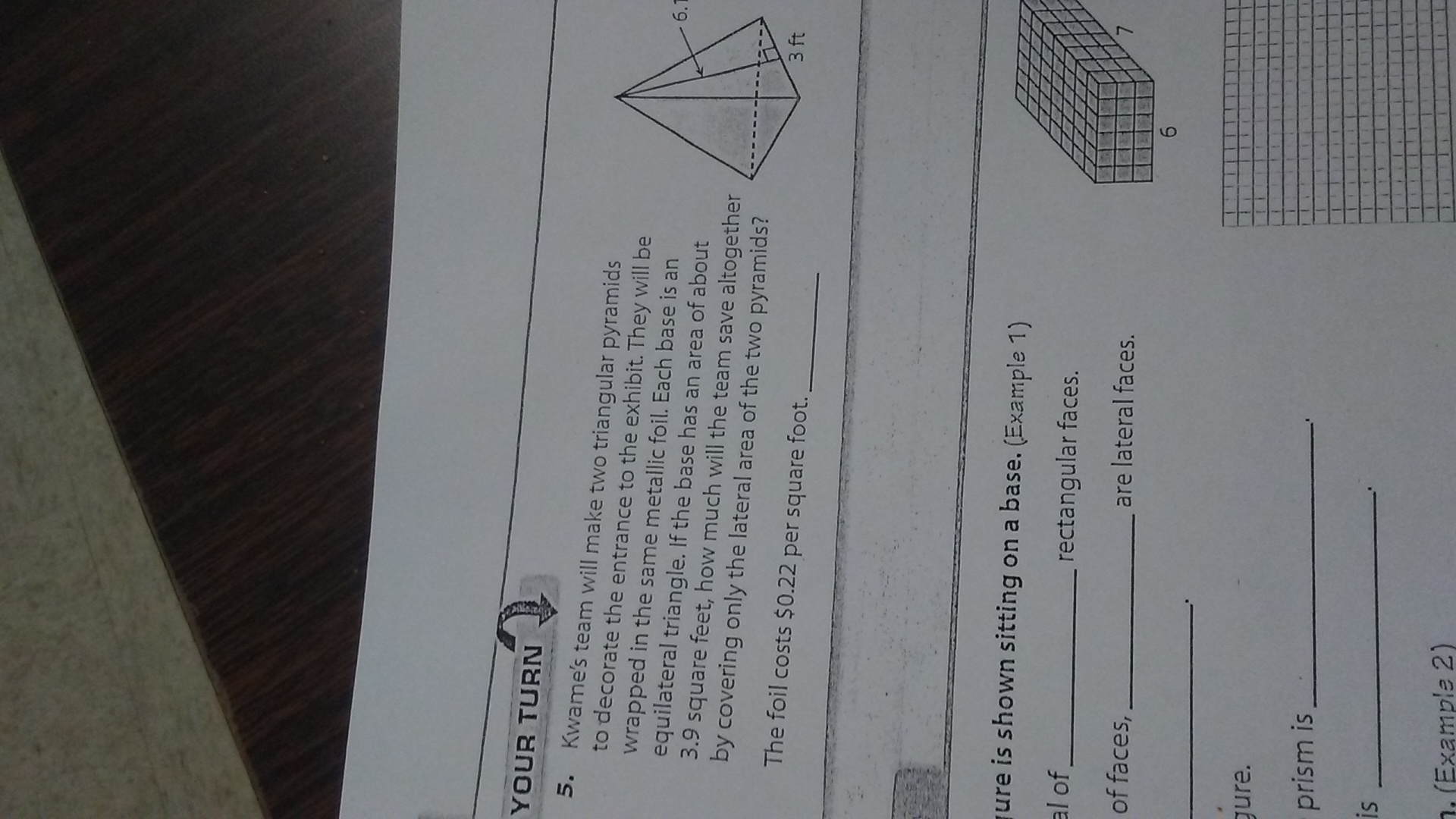 since the price of 1 square foot of foil is $0.22, multiply the total surface area of the two pyramids by 0.22 to find the cost of covering the entire pyramids. We'll call this number Price1 and set it aside for now.
