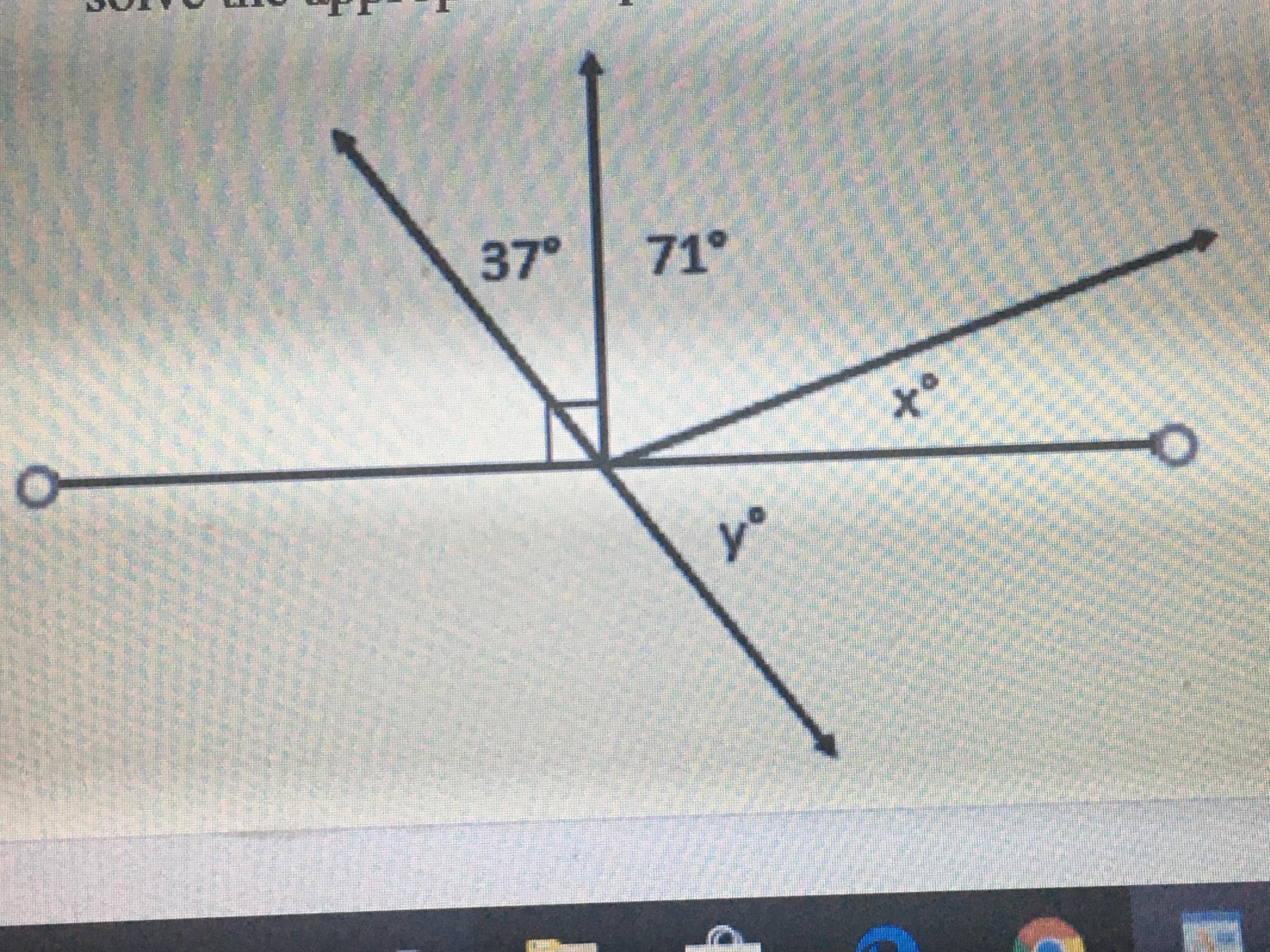 From the figure we have that y is supplementary to the angle (37° + 71° + x°), that is, they summed form a angle of 180°.