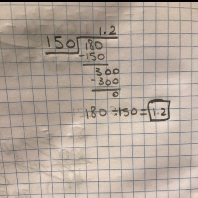 150 goes in 180 1 time. Subtract 159 from 180, and you get 30. 150 does not go in 30. So, you have to add a decimal point after the 1 and put a 0 after 300. 150 then goes in 300 2 times. Therefore, the answer to 180/150 is 1.2.