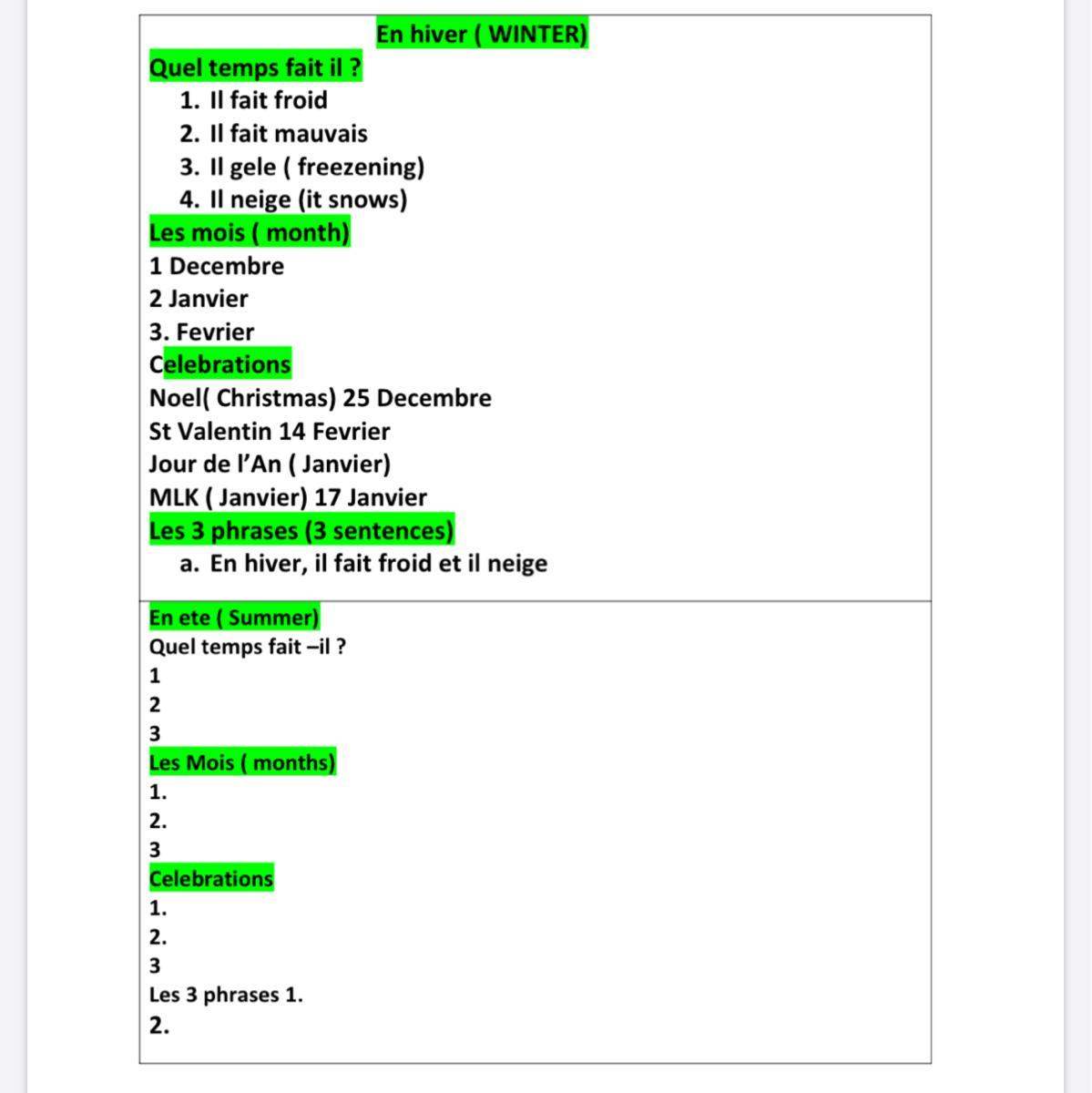 (summer) 1: Il fait chaud 2: Il pleut 3: Ilsalue (months) 1: juin 2: juillet 3: août (celebrations) 1: (fourth of july) 4 juillet 2: (labor day) Fête du travail 3: (national hot dog day) journée nationale du hot-dog (Les 3 phrases 1) en été il fait chaud, et je fête le 4 julliet.