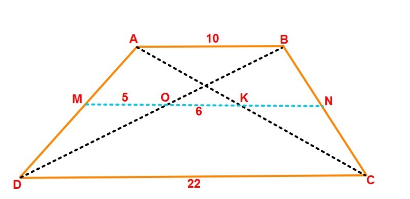 MK is a midsegment of triangle ADC, so |MK|=1/2 * |DC|=1/2 * 22=11