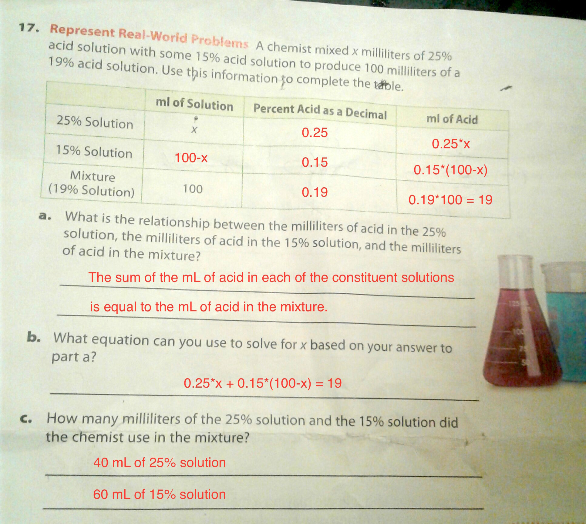 I find the problem confusing because it forces a certain sequence of thought process, and I find I get way beyond these questions and answers rather quickly. I would start with the equation of part B, having already recognized the conversions of percent to decimal and the need to make the acid quantities add up. Doing the problem a different way gets you to the answer in part C without any of these "steps," so going back and trying to fill in the "steps" seems awkward, at best.