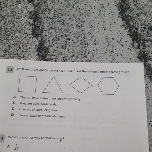 The answer should be A as quadrilateral means polygons with 4 sides so the the triangle and the hexagon won't be also none is parallelogram and perpendicular lines means giving a angle of 90 degreess so no