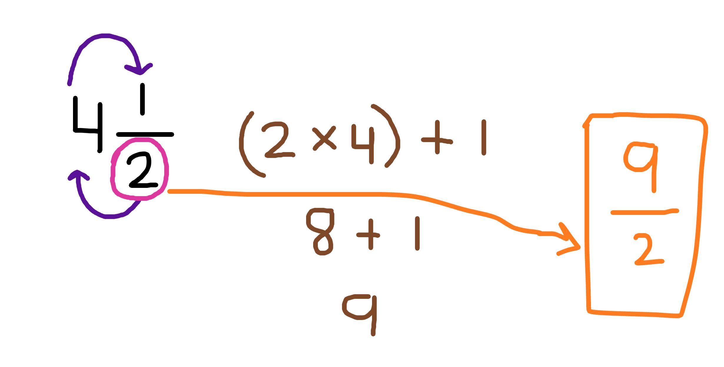 So here, we multiply the denominator, 2, times the whole number, 4, then we add the numerator, 1. So we have (2 × 4) + 1 of 8 + 1 which is 9.