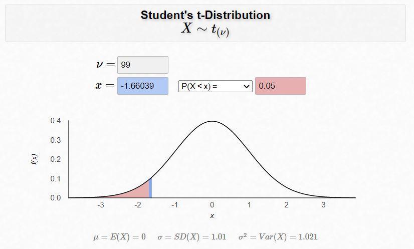 The critical value for a level of significance is α=0.05, a left-tailed test and 99 degrees of freedom is tc=-1.6604.