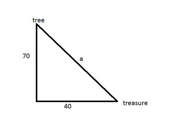 The straight line distance from the tree to the treasure =?