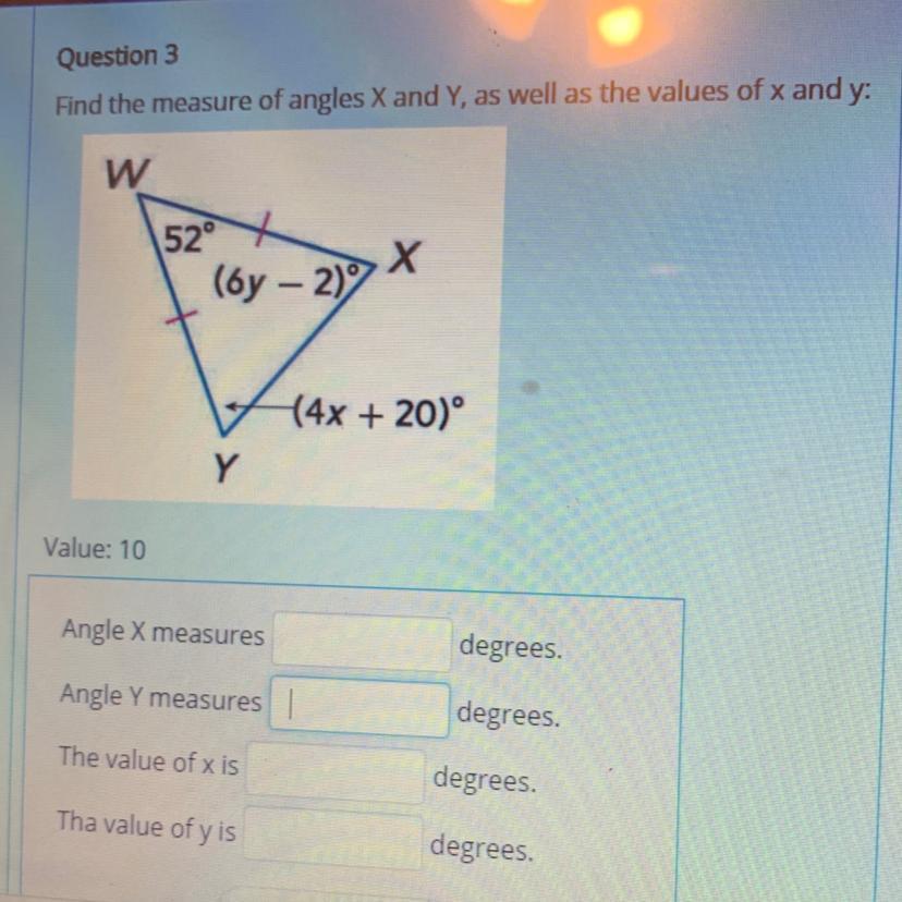 By the Isosceles Triangle Theorem, if 2 sides of a triangle are congruent to each other, than the angles opposite those sides are also congruent. We see by the markings on the triangle that WX and WY are congruent. That means that angle Y (which is across from WX) and angle X (which is across from WY) are the same measure. We can set them equal to each other because of this: