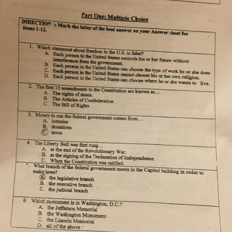 1. C - freedom of religion is stated in the Bill of Rights, AKA the first ten amendments in the constitution. 2. C - Bill of Rights, as mentioned before 3. C - taxes; Taxes that we pay from our salaries or just buying things goes towards the government. This is how they fund things such as the military or even as simple of a task as filling a pothole. 4. B - The signing of the DOI 5. A - legislative 6. D - all of the above