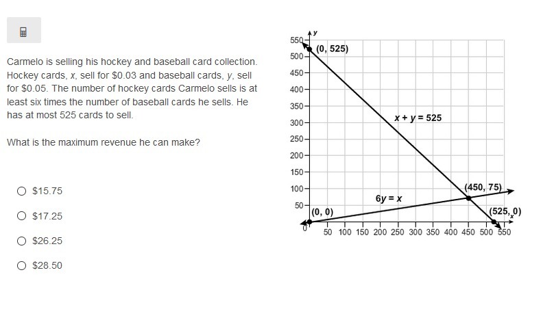The number of hockey cards Carmelo sells is at least six times the number of baseball cards he sells. There are at most 525 cards to sell.