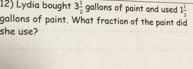 <h2><em>3 1/2 - 1 1/3 = 2 1/6.</em></h2><h2><em>3+1/2−1−1/3</em></h2><h2><em>Rewrite it with everything separated.</em></h2><h2><em>Solve the whole numbers.</em></h2><h2><em>3 - 1 = 2.</em></h2><h2><em>Find the LCD of The Fractions.</em></h2><h2><em>LCD is 6.</em></h2><h2><em>3/6 - 2/6 = 1/6.</em></h2><h2><em>2 + 1/6 = 2 1/6.</em></h2><h2><em>She used 2 1/6 gallons of paint. Hope this helps and have a Nice day...! o/</em></h2>