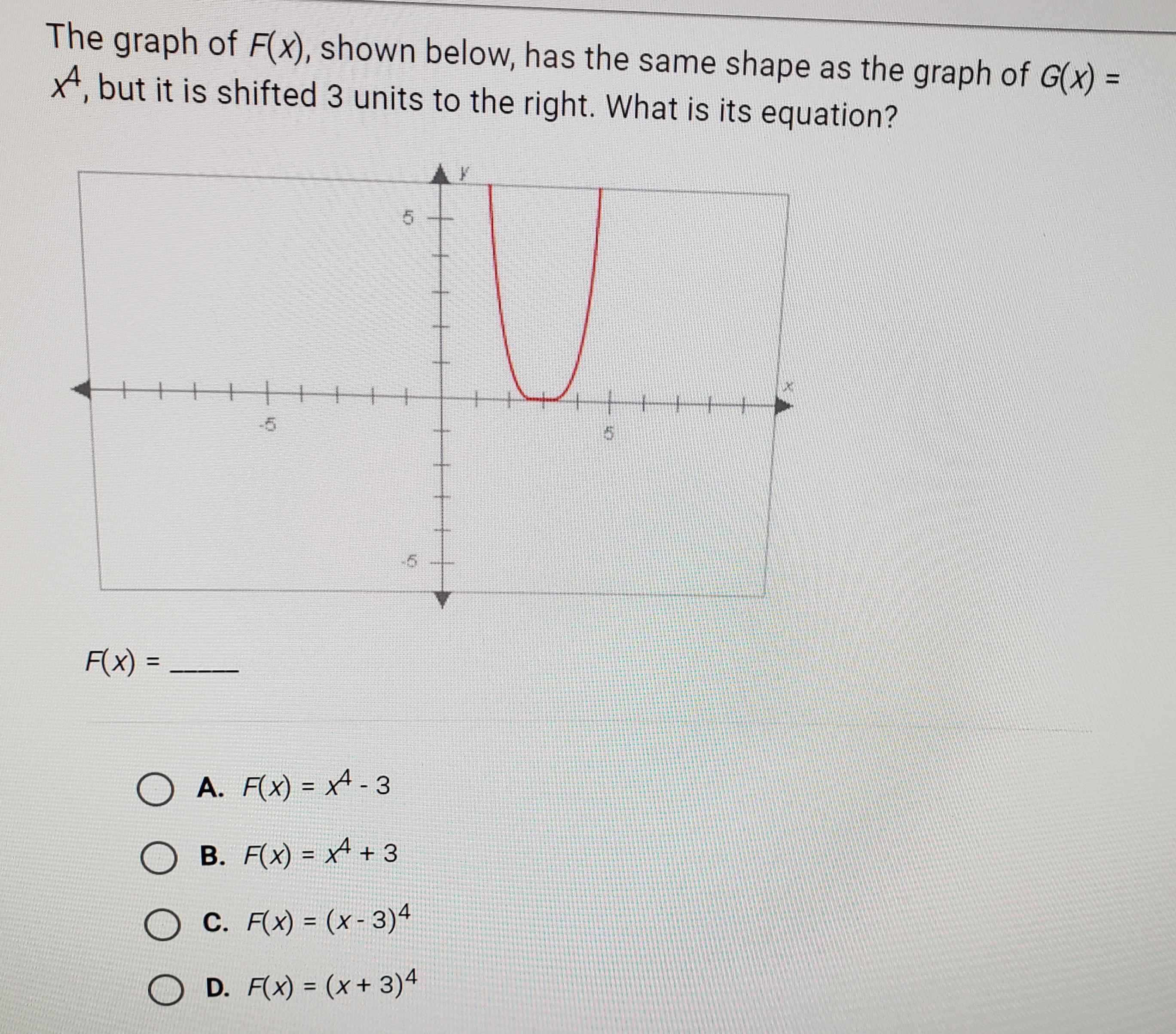 As the graph of x^4 has been shifted 3 units to the right, the function becomes F(x) = (x - 3)^4 (Answer C)