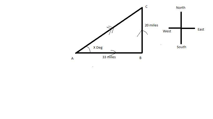 A helicopter takes off from its home base A and travels 33 miles East to B and then 20 miles North to C.