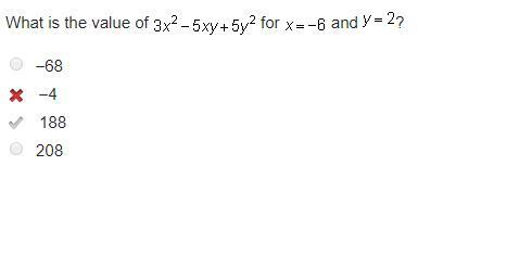the value of 3x^2-5xy+5y^2 for x=-6 and y=2 is 188.
