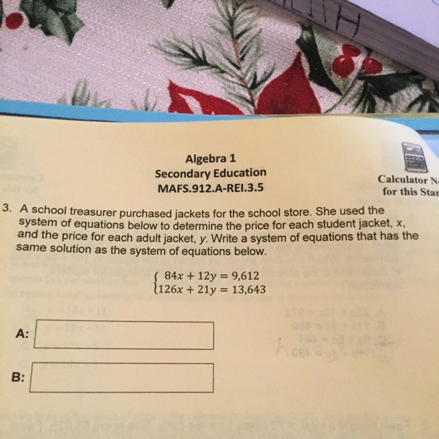 h student jacket, x , and the price for each adult jacket , y. Write a system of equations that has the same solution set as the system of equations