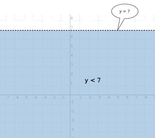 the line in the graph is a dashed one, because it does NOT include the points at the border, y < 7, "y" is less, not equals to, but less than 7.