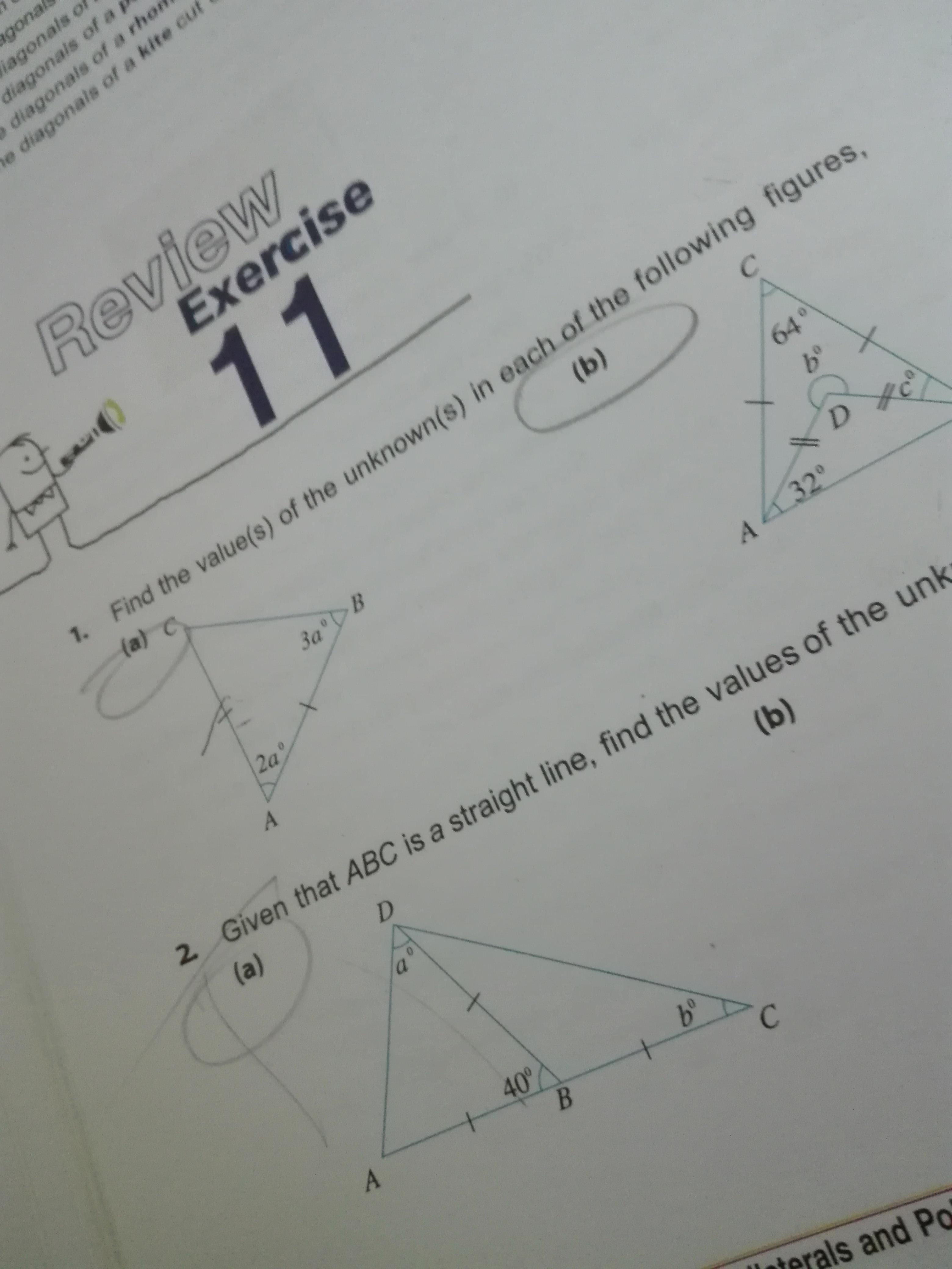 Step-by-step explanation: From the figure in number in number 1(a), we have an isosceles triangle with sides AB and AC being equal in dimensions (as shown by the markings). Therefore angles B and C are also equal (angles subtended by equal sides in an isosceles triangle). If angle B is 3a then angle C equals 3a as well. if the sum of the interior angles of a triangle equals 180, then;