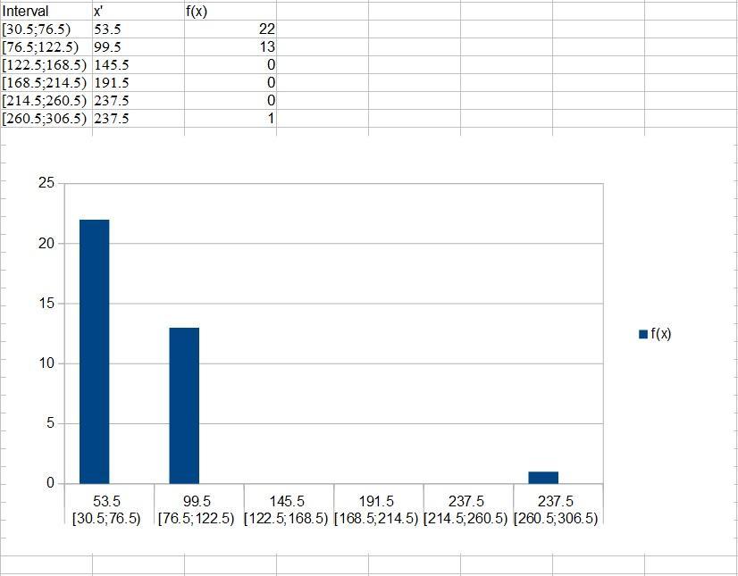 [30.5;76.5): 54 55 55 57 57 59 60 65 65 65 66 68 68 69 69 70 70 70 75 75 75 75 ⇒ f(x)= 22
