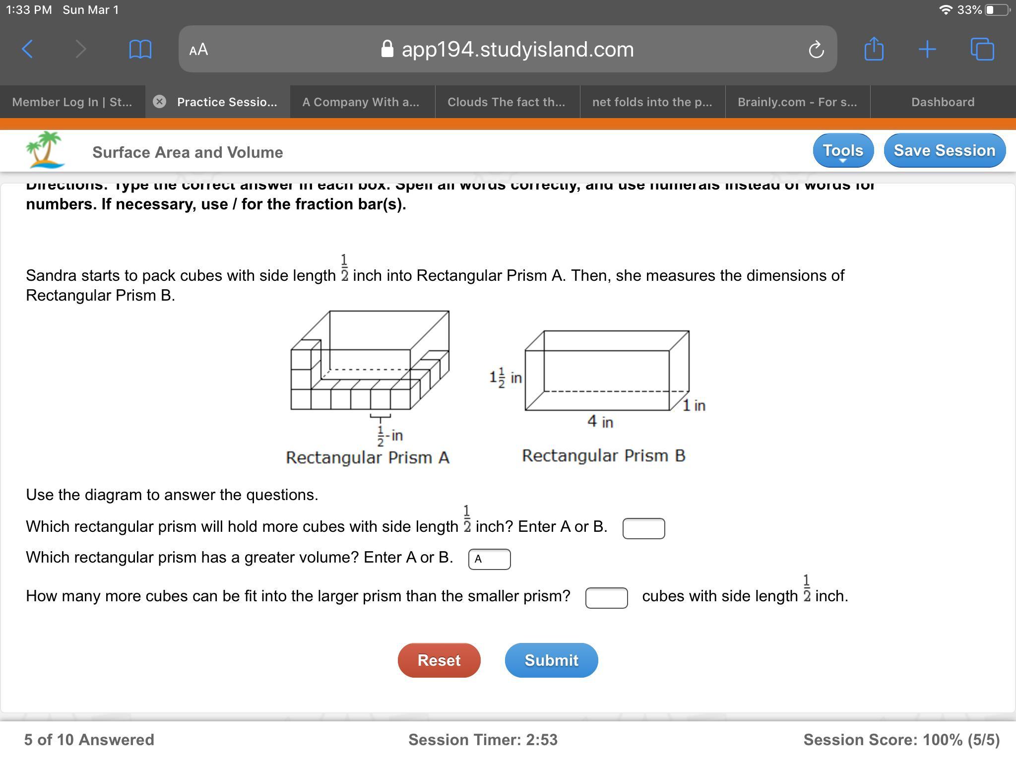 (b) Prism A has a larger volume (which is why it holds more cubes)