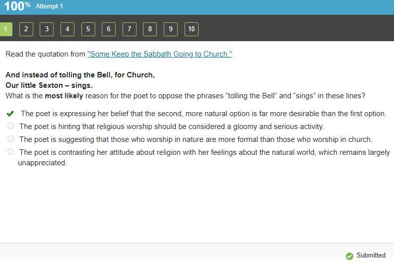 – sings. What is the most likely reason for the poet to oppose the phrases “tolling the Bell” and “sings” in these lines? The poet is expressing her belief that the second, more natural option is far more desirable than the first option. The poet is hinting that religious worship should be considered a gloomy and serious activity. The poet is suggesting that those who worship in nature are more formal than those who worship in church. The poet is contrasting her attitude about religion with her feelings about the natural world, which remains largely unappreciated.
