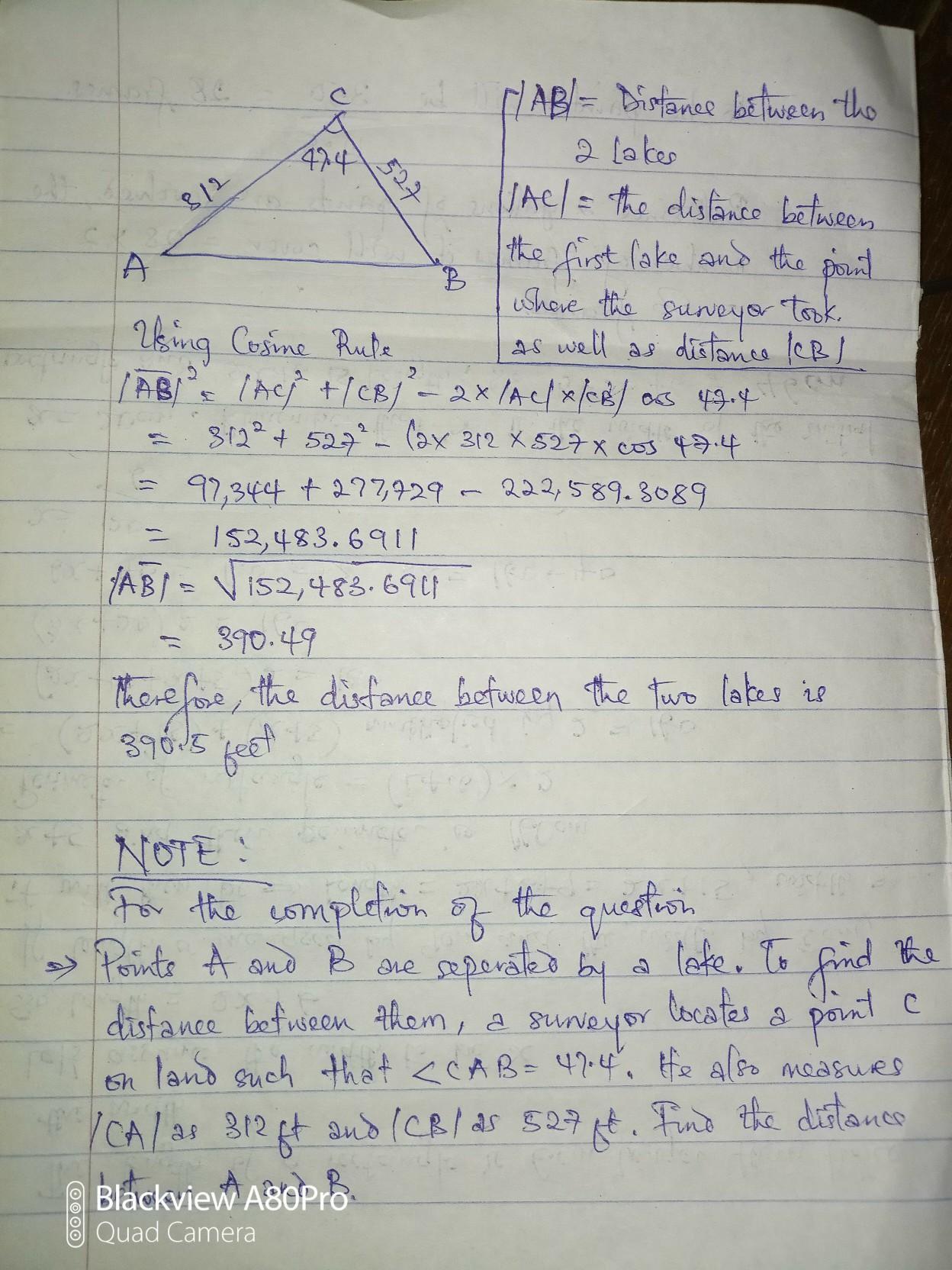 Distance across the lake from A to B = 686.3 ft