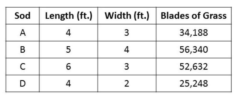 The table shows the dimensions and the numbers of blades of grass on four rectangular pieces of sod. Select and drag the pieces