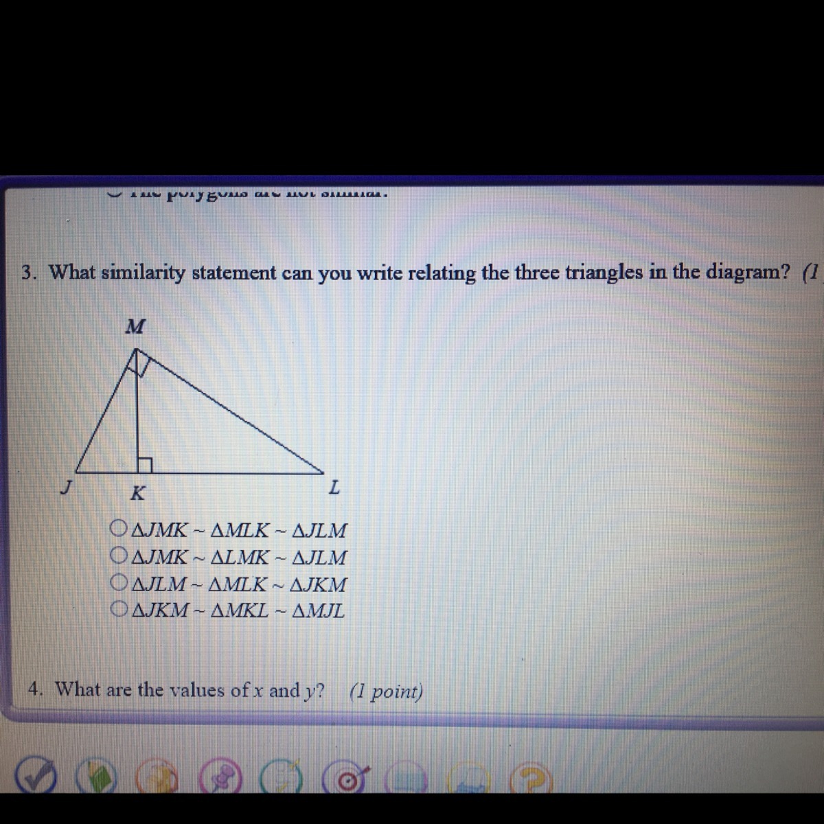 In the given problem, we can write a similarity statement relating to the three triangles in the diagram. And the answer is letter "D" triangle JKM≈ triangle MKL ≈ triangle MJL. We have arrived in this due to the ratios of corresponding legs of the three triangles and also because of same angles formed in the triangles.
