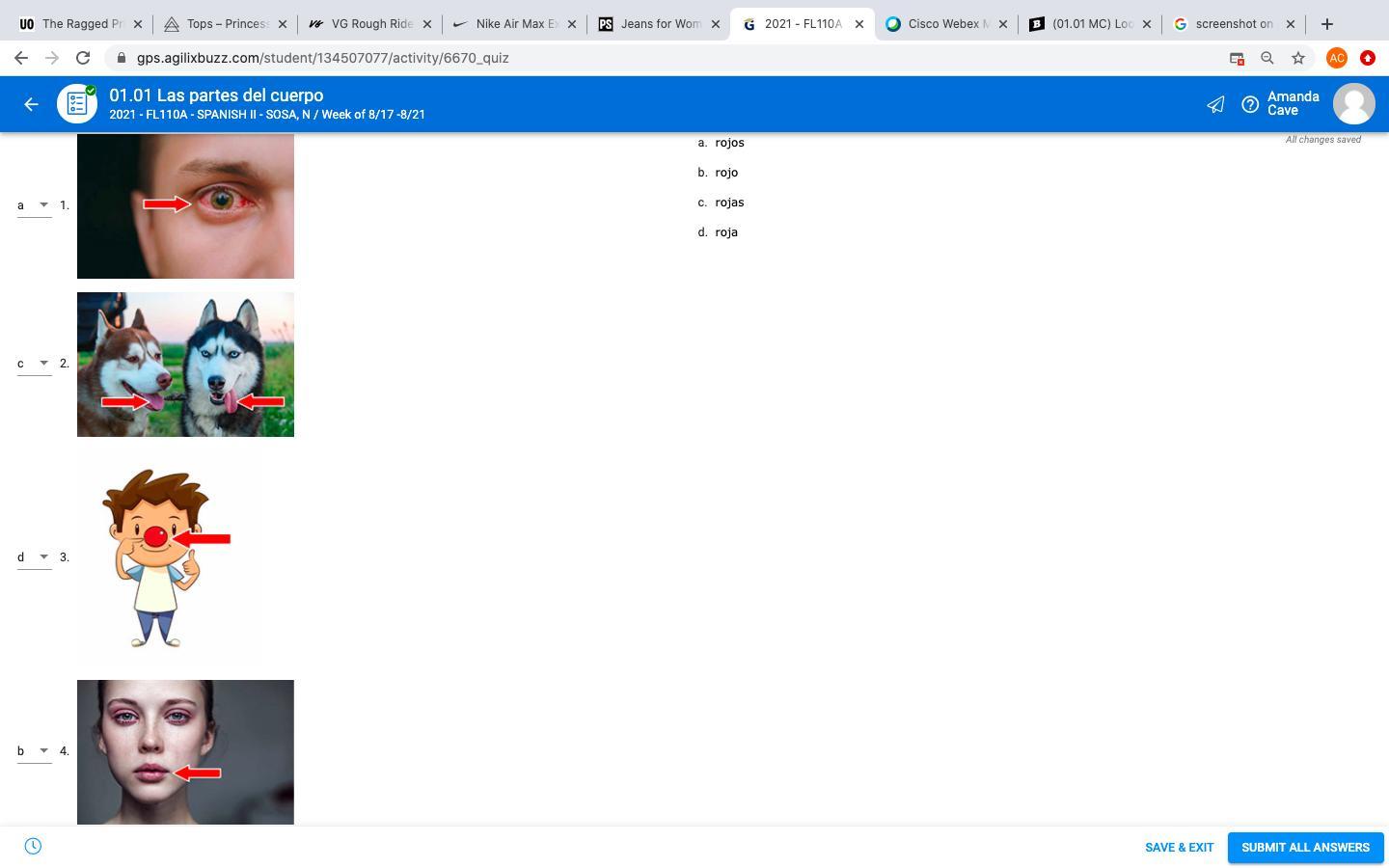 he adjective. (4 points) a 1. closeup image of half of a mans face with a ruby colored eye c 2. two dogs with ruby colored tongues d 3. boy pointing at ruby colored nose b 4. closeup image of female ruby colored lips
