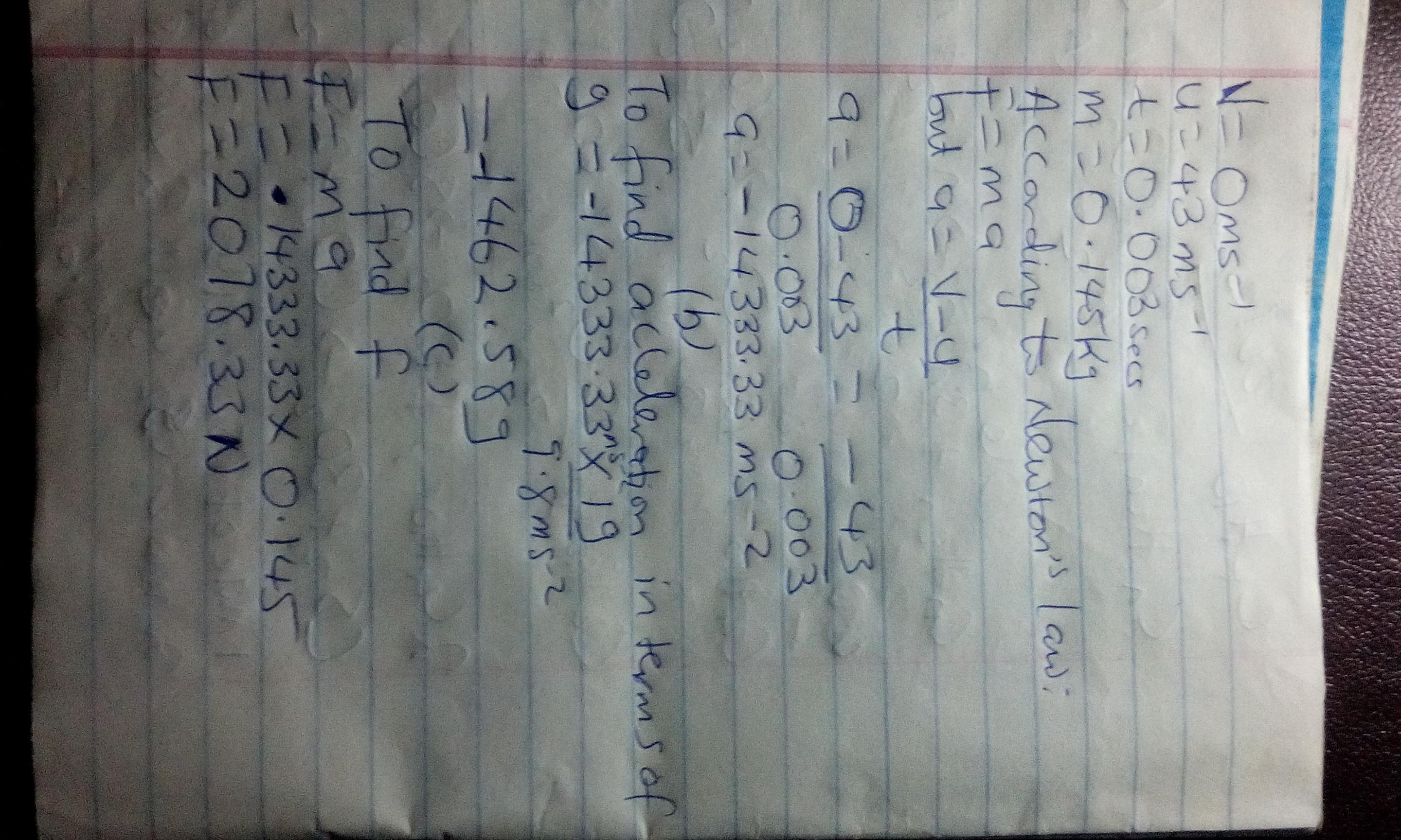 The acceleration (deceleration) is easily found from from the information provided. Then the acceleration is obtained in terms of g as shown in the solution attached. The force is obtained from F=ma as shown in the image attached. Note the acceleration is negative because the ball was coming to rest. (The ball was caught).