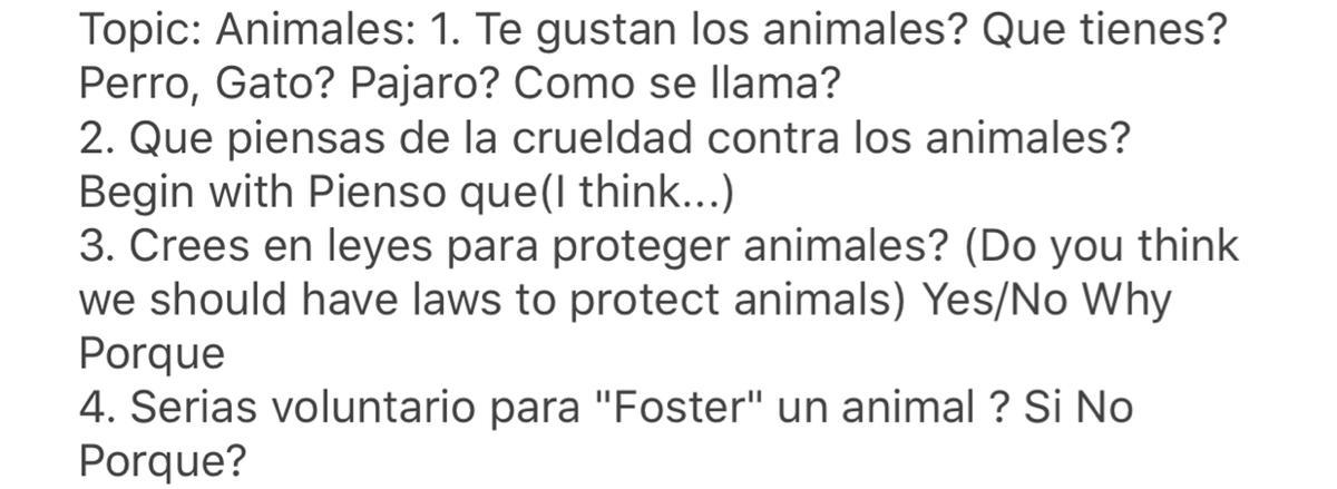 3. Yo creo que deberiamos tener leyes para proteger a los animales, por que muchos animales en los zoologicos estan siendo abusados, y no les dan la comida correcta. (In english: I think that we should have laws that protect animals because in many zoos, animals are being mistreated, and not given the right food.)