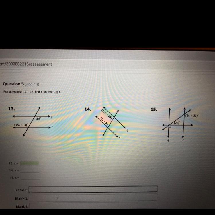 15. If you remove the horizontal line, the given angles are <em>corresponding angles</em>. These are <em>congruent</em>. However, make sure to add back the horizontal transversal line. Since this creates a 90°, add this to the given angle value: