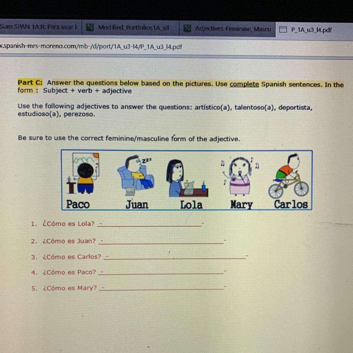 <h3>Part C: Answer the questions below based on the pictures. Use complete Spanish sentences. In the form: Subject + verb + adjective.</h3><h3>Use the following adjectives to answer the questions: artístico(a), talentoso(a), deportista, estudioso(a), perezoso(a)</h3>