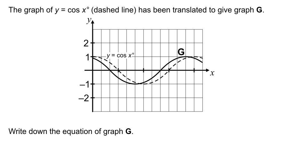 We are told this is a translation. Look at the original graph which is dashed. That is the graph of y = cos x. Now look at the translated graph which is solid. Compared to the dashed graph, the solid line is translated to the left.