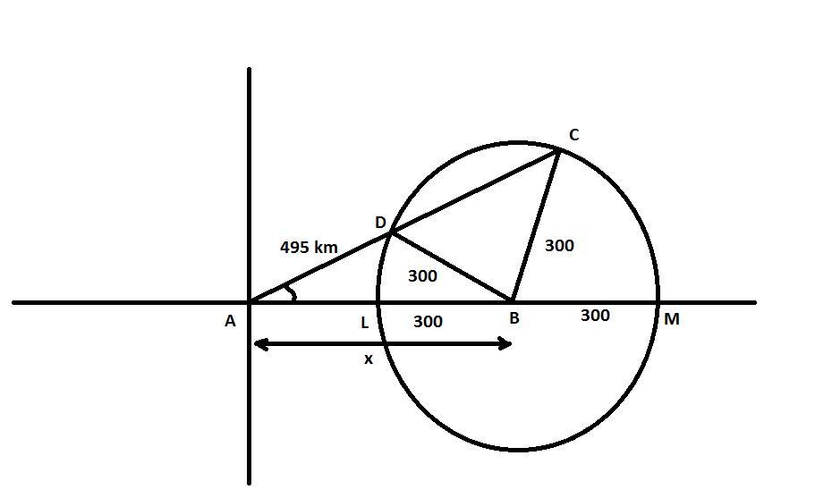 The value of x can not be 212.696 as the length of LB (radius) itself is 300 km.